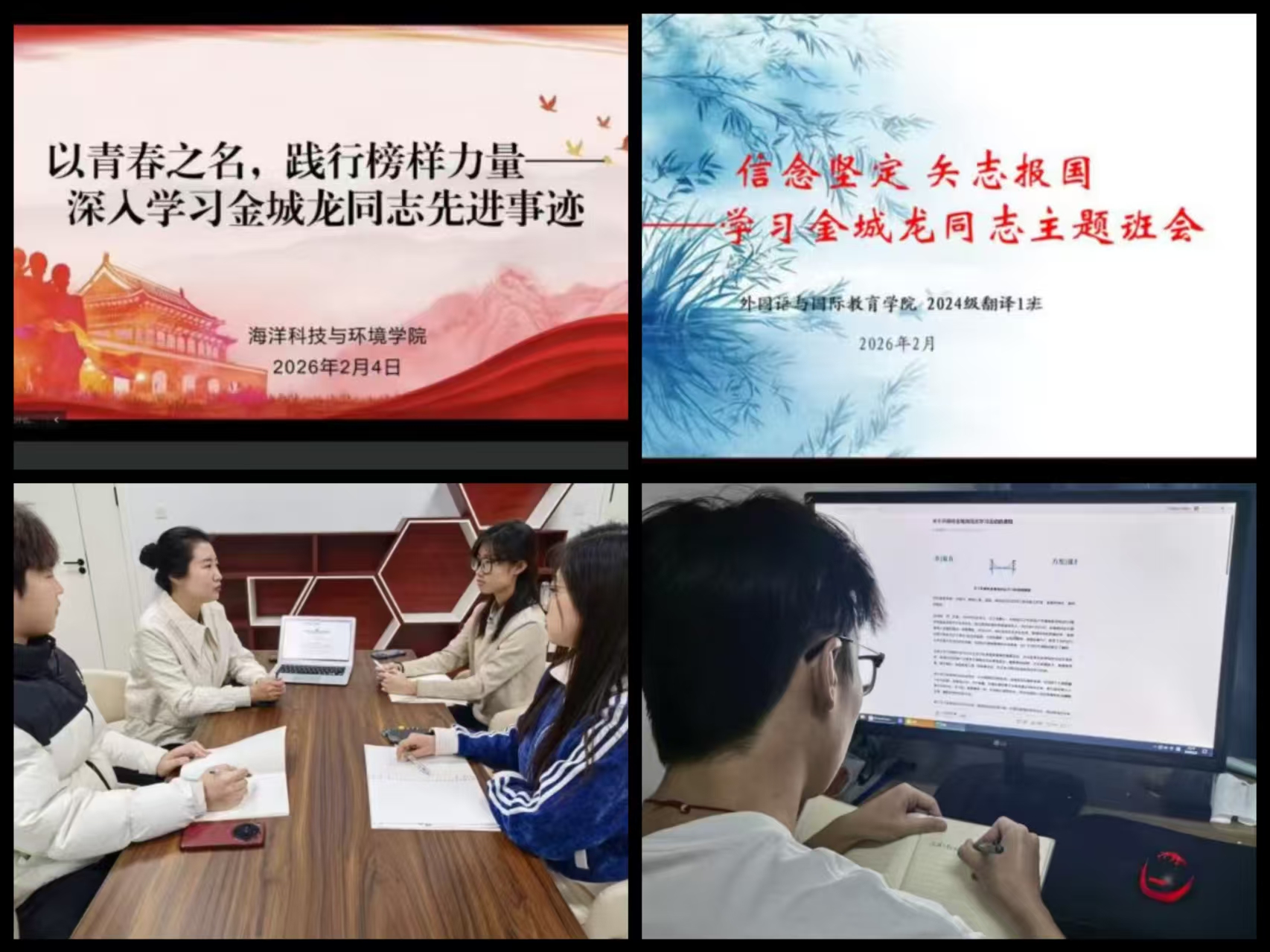 海洋科技与环境学院应用物理学专业25级1班 白鸿哲:金城龙同志以坚定的信念、务实的作风和无私的奉献精神,为我们树立了鲜明标杆。我将以他为镜,在应用物理学专业学习中脚踏实地、攻坚克难,把知识转化为服务人民的能力,努力成为一名无愧于时代的奋斗者。