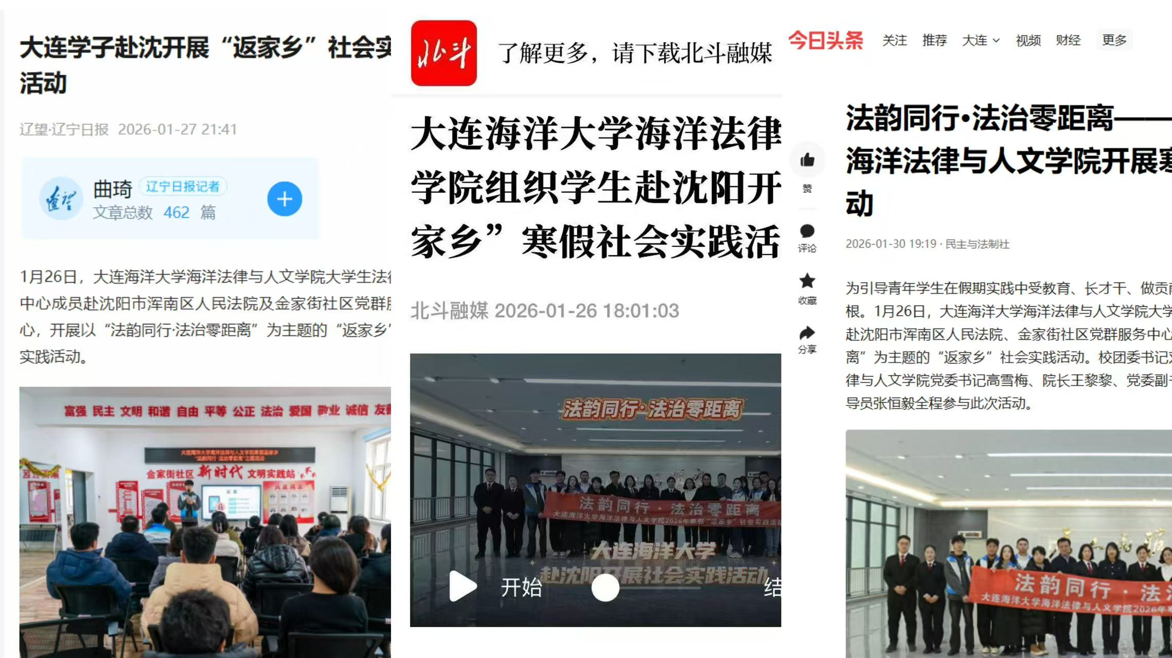 辽宁日报·辽望客户端、北斗融媒等媒体平台对我校海洋法律与人文学院开展的“返家乡”社会实践活动进行了专题报道。