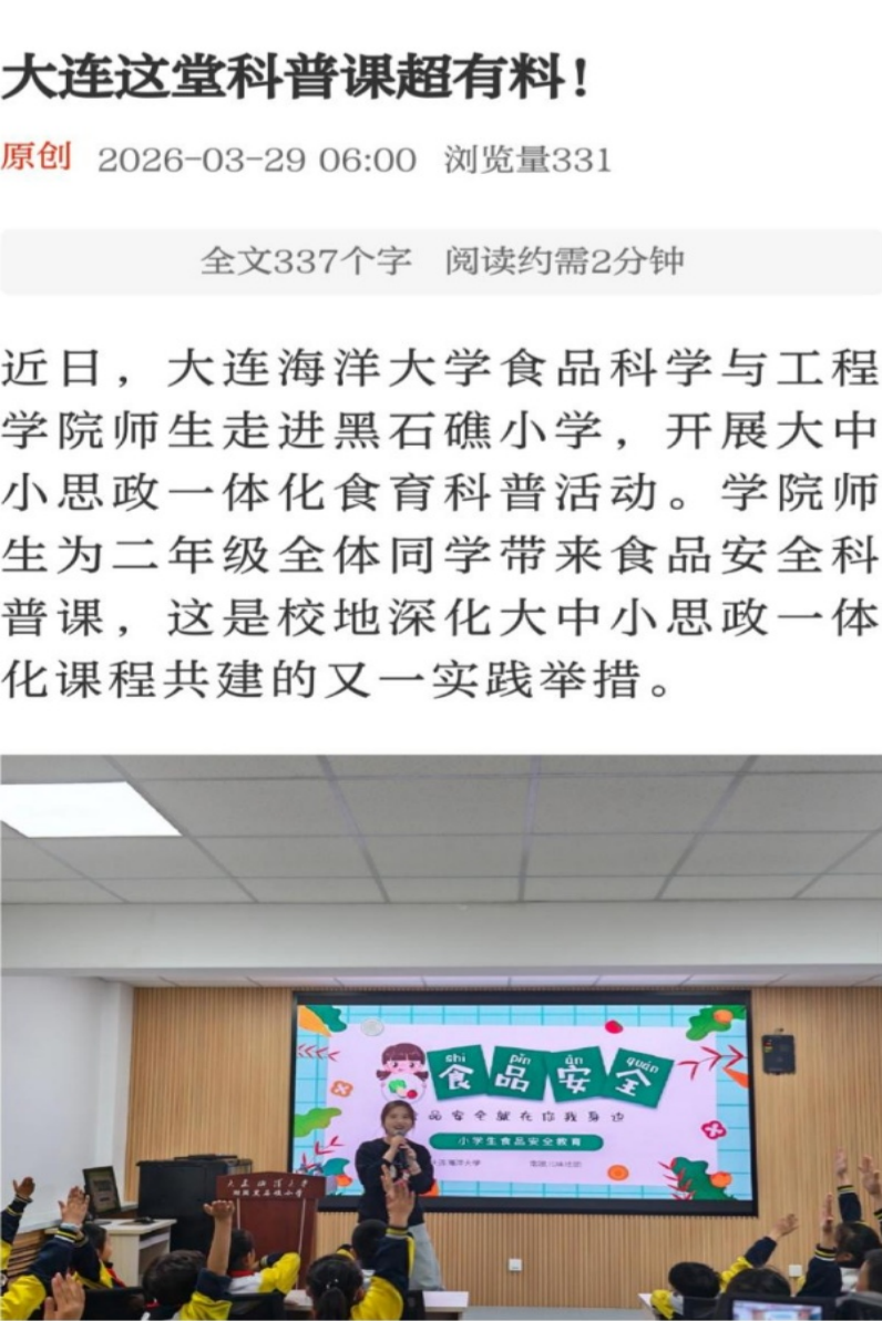 近日,大连云媒体平台以《大连这堂科普课超有料!》为题,报道了我校食品科学与工程学院走进附属黑石礁小学,开展大中小思政一体化食育科普活动。
