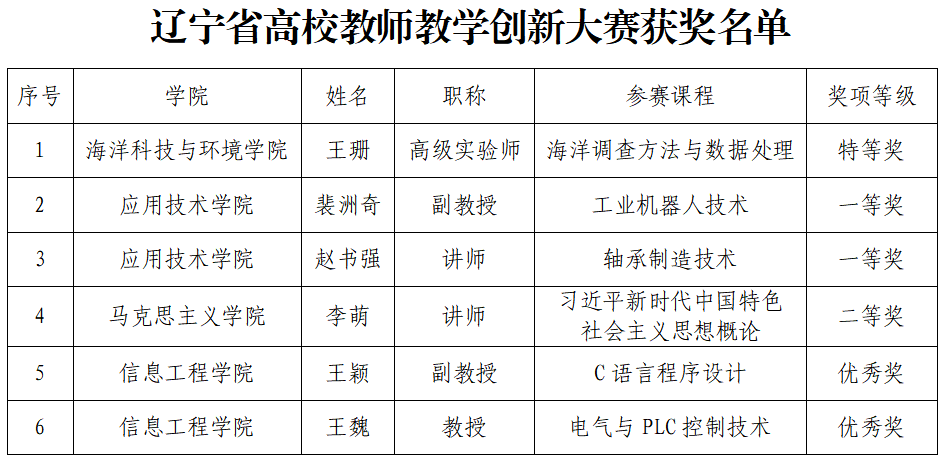 4月26日,2026年辽宁省高校教师教学创新大赛在沈阳圆满落幕。经过校赛遴选、省级复赛、省级决赛的多轮激烈角逐与层层选拔,我校参赛教师凭借扎实的教学功底、创新的教学设计与出色的现场竞技表现,斩获省级特等奖1项、一等奖2项、二等奖1项、优秀奖2项。其中,斩获省级特等奖的海洋科技与环境学院王珊老师,将作为辽宁省参赛代表出征第六届全国高校教师教学创新大赛,在全国舞台上展现我校教师的教学风采与育人成果。