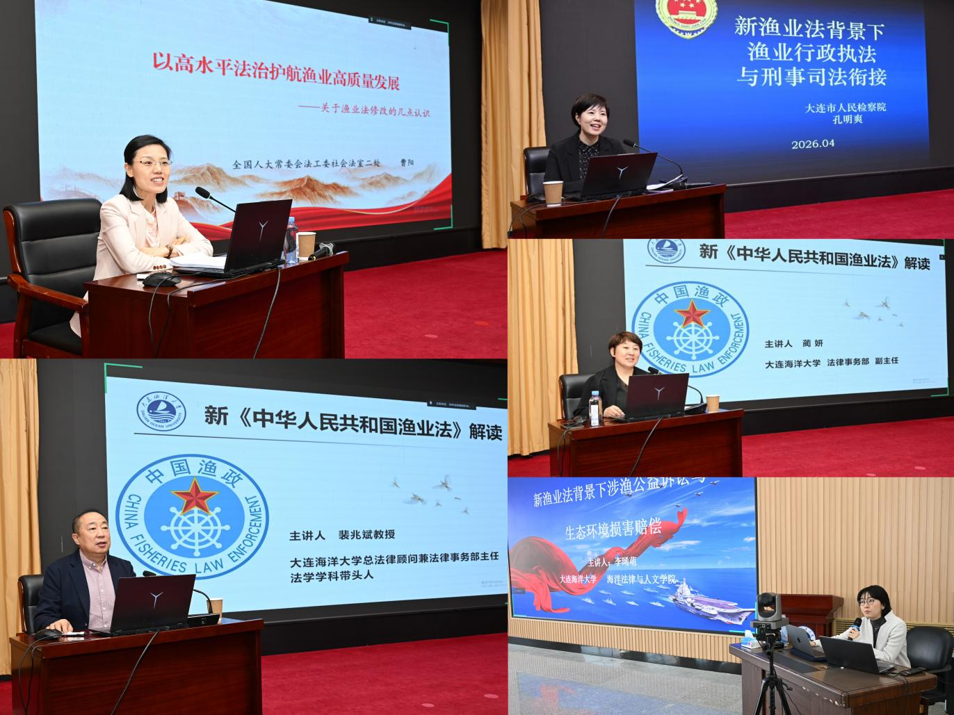 活动中,曹阳处长以《以高水平法治护航渔业高质量发展——关于渔业法修改的几点认识》为题,介绍了新《中华人民共和国渔业法》的修改背景、过程及意义,强调要做好新法的学习宣传和贯彻实施;我校裴兆斌教授作《新〈中华人民共和国渔业法〉解读》专题讲座,解读了新法的核心精神与十大制度亮点,并针对休闲渔业边界、历史养殖处置、海警协作等执法疑难问题提出实务指引;我校蔺妍副教授作《新渔业法捕捞业和渔业增殖养护解读》专题讲座,解读了新法在捕捞业管控、渔业资源保护、打击“三无”船舶及法律责任等方面的制度亮点,并结合典型案例强调执法人员应依法履职;大连市人民检察院第一检察部孔明爽主任以《新渔业法背景下渔业行政执法与刑事司法衔接》为题,阐释了渔政行刑衔接的规定与证据转换,明确了案件移送路径。我校李晞萌讲师以《新渔业法背景下涉渔公益诉讼与生态环境损害赔偿》为题,梳理了渔业渔政主管部门在生态环境保护中的法定职责,解读了涉渔公益诉讼与生态环境损害赔偿制度的适用规则及程序衔接。