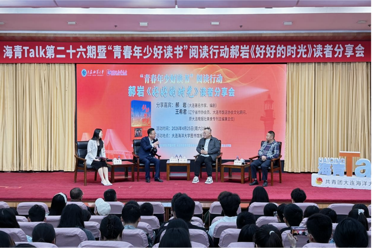 4月25日,我校在黑石礁校区图书馆报告厅举办“海青Talk”第二十六期活动——郝岩《好好的时光》读书分享会。本次活动特邀作家郝岩、王希君,以及我校马克思主义学院副教授孙大志、教师石丽萍担任嘉宾,为现场师生带来一场兼具文学温度与时代情怀的沉浸式文学盛宴。校团委、图书馆负责人及师生代表共230余人参加活动。