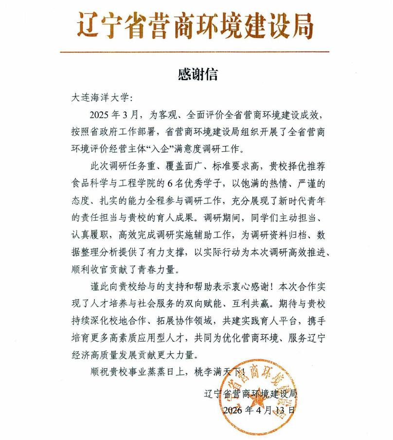 近日,辽宁省营商环境建设局向我校发来感谢信,对我校食品科学与工程学院选派优秀研究生参与全省营商环境评价“经营主体”入企满意度调研工作表示感谢,并对同学们的责任担当和学院的育人成效给予高度肯定。